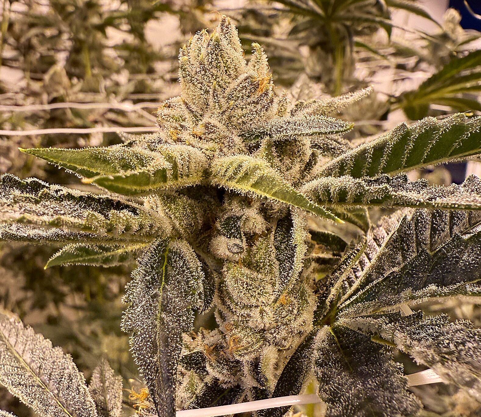 The nose leans heavily into sharp lime zest layered over deep gas and a chemical, eve watering, burning rubber backend, almost test-tube-meets-tire-shop, giving it that signature Umami complexity. Plants show strong lateral branching with tight internodal spacing. Moderate 2x stretch and 8-9 week flowering time.