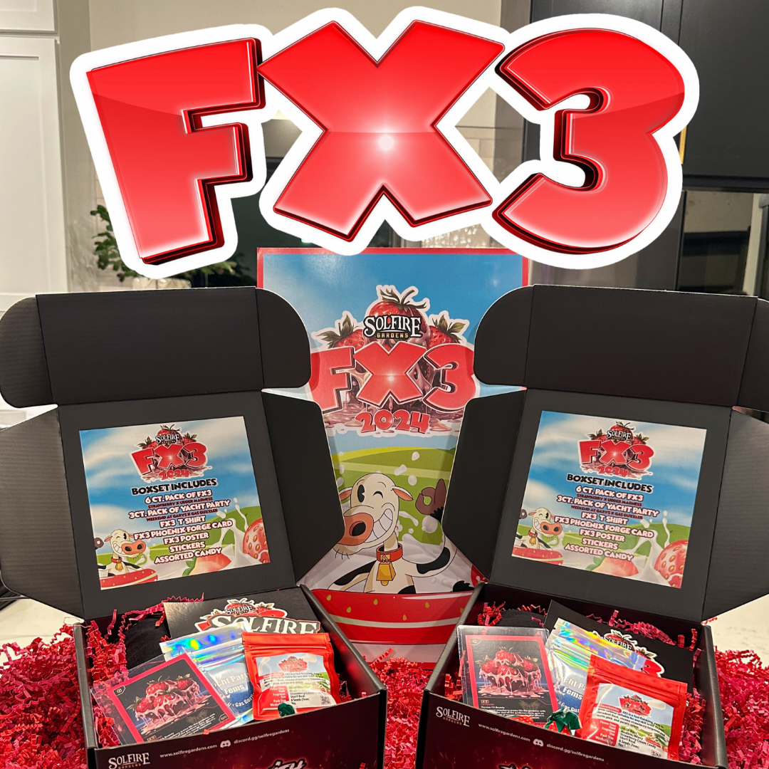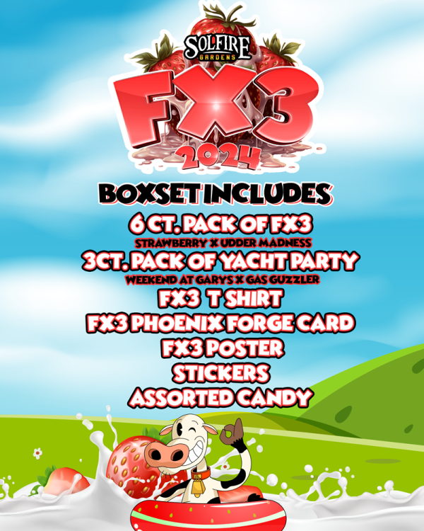 It includes everything displayed and features packaging similar to our legendary Banana Runtz. The package will contain a minimum of 6 seeds of FX3 in a branded soft package containing strawberry candies. Additionally, each box set includes a bonus pack of the unreleased “Yacht Party” (Weekend at Garys x Gas Guzzler).